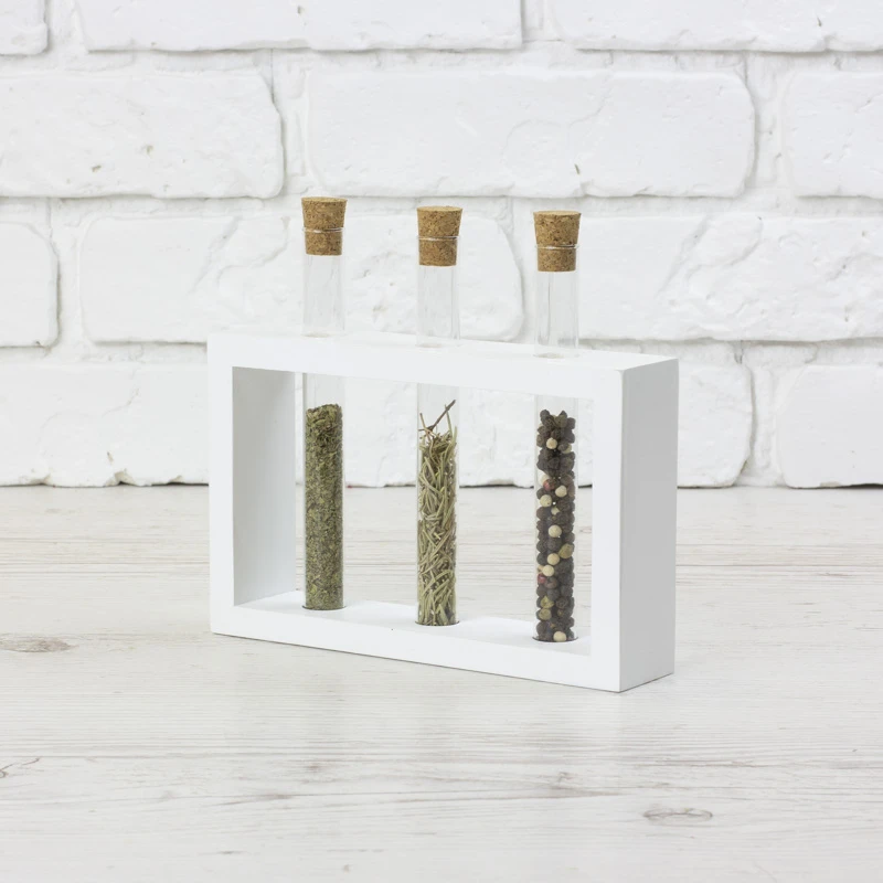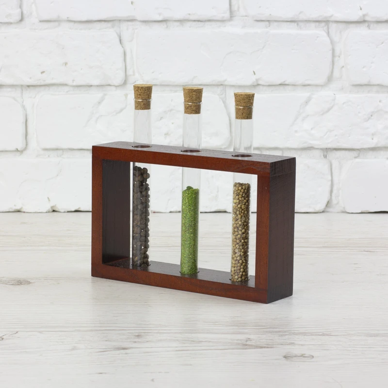 Дерев`яна підставка з пробірками виготовлена з натурального дерева. Підходить для зберігання спецій, канцелярії, квітів або сухоквітів. У комплексі з підставкою йде йоршик для чистки та 3 пробірки з корковими пробками.