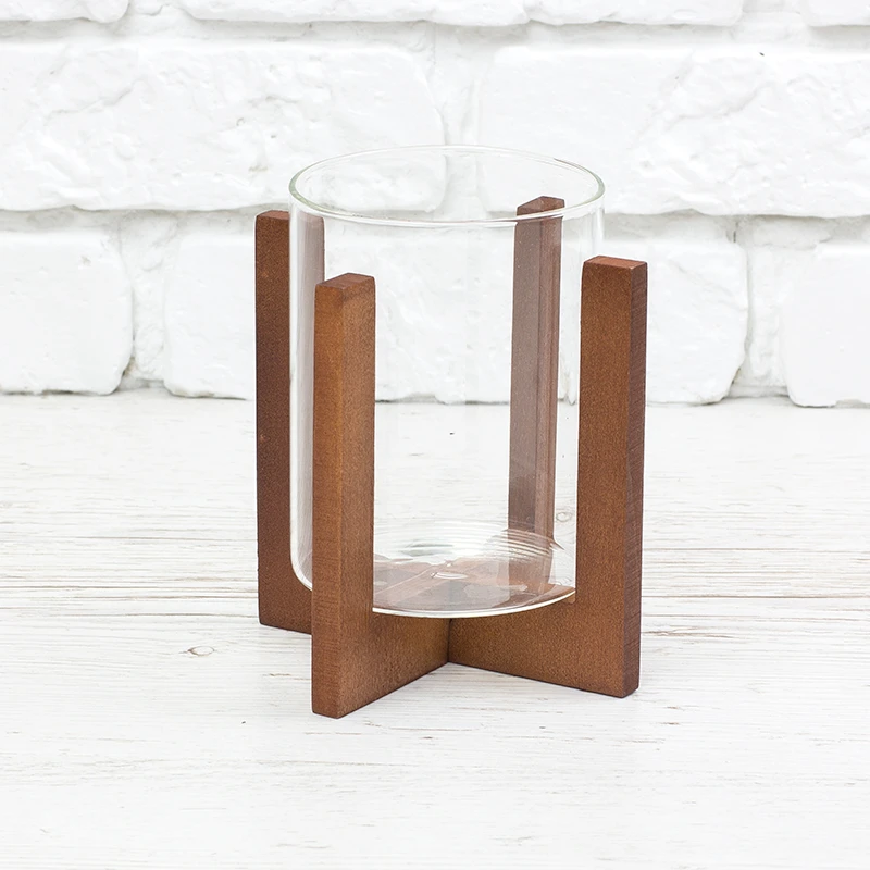 Декоративний підсвічник з натурального дерева, складається з двух частин, дерев`яної хрестовини та скляного стакану.