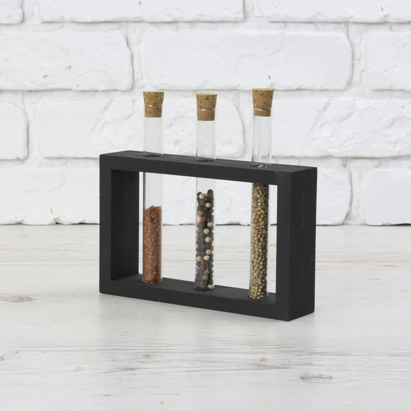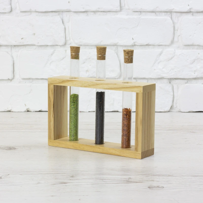 Дерев`яна підставка з пробірками виготовлена з натурального дерева. Підходить для зберігання спецій, канцелярії, квітів або сухоквітів. У комплексі з підставкою йде йоршик для чистки та 3 пробірки з корковими пробками.
