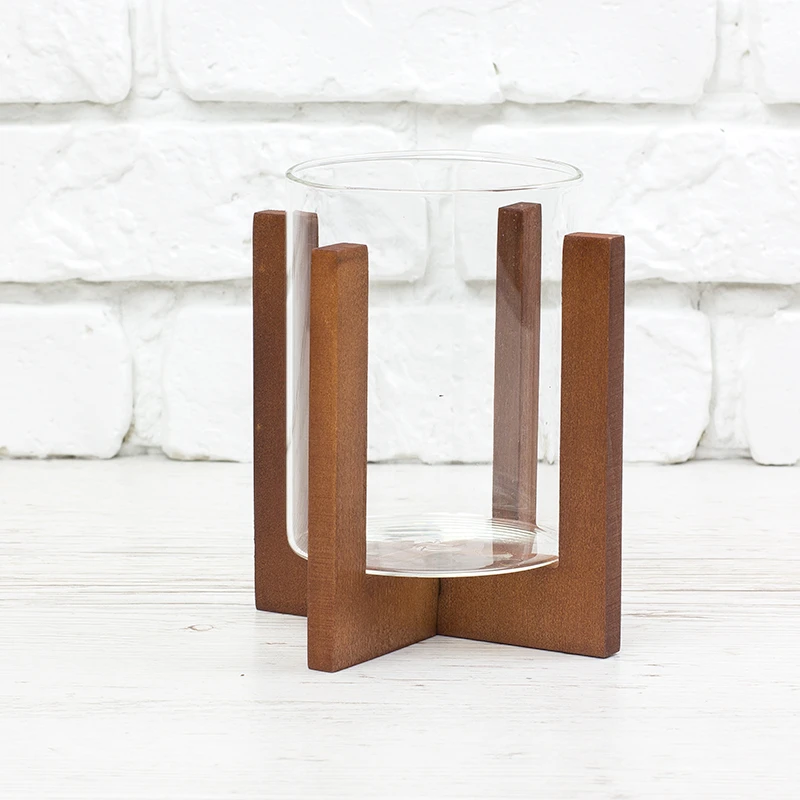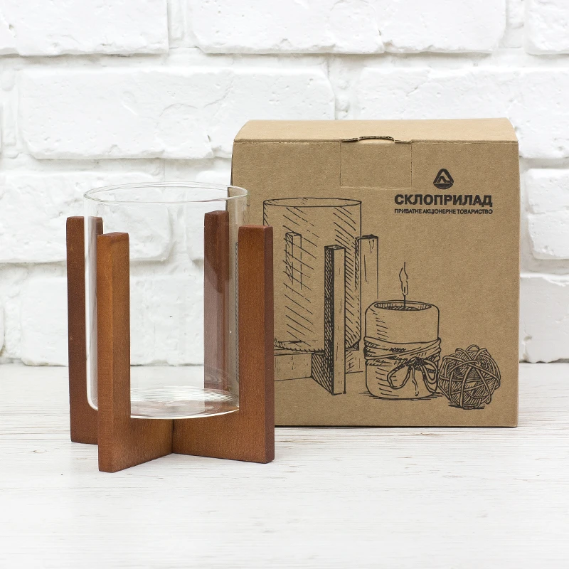 Декоративний підсвічник з натурального дерева, складається з двух частин, дерев`яної хрестовини та скляного стакану.