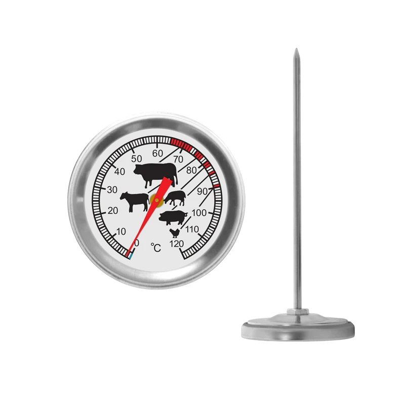 Термометр для м`яса зі щупом із нержавіючої сталі, полегшує процесприготування м`яса. Достатньо занурити прилад у саму глибоку частину страви та поставити його в духову шафу.На шкалі термометру, червоним кольором, виділені температурні зони готовності для різних видів м`яса.