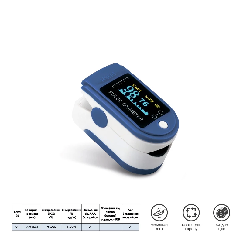 Використовуються у профілактичних цілях, для оцінки функцій дихальної системи у людей з респіраторними або легеневими проблемами, людей із серцево-судинними захворюваннями. Мініатюрні габаритні розміри пульсоксиметра дозволяють носити його з собою і використовувати в будь який час. Для зручності носіння у комплекті йде підвісний шнурок.